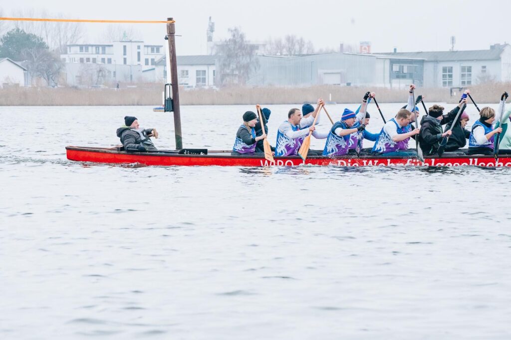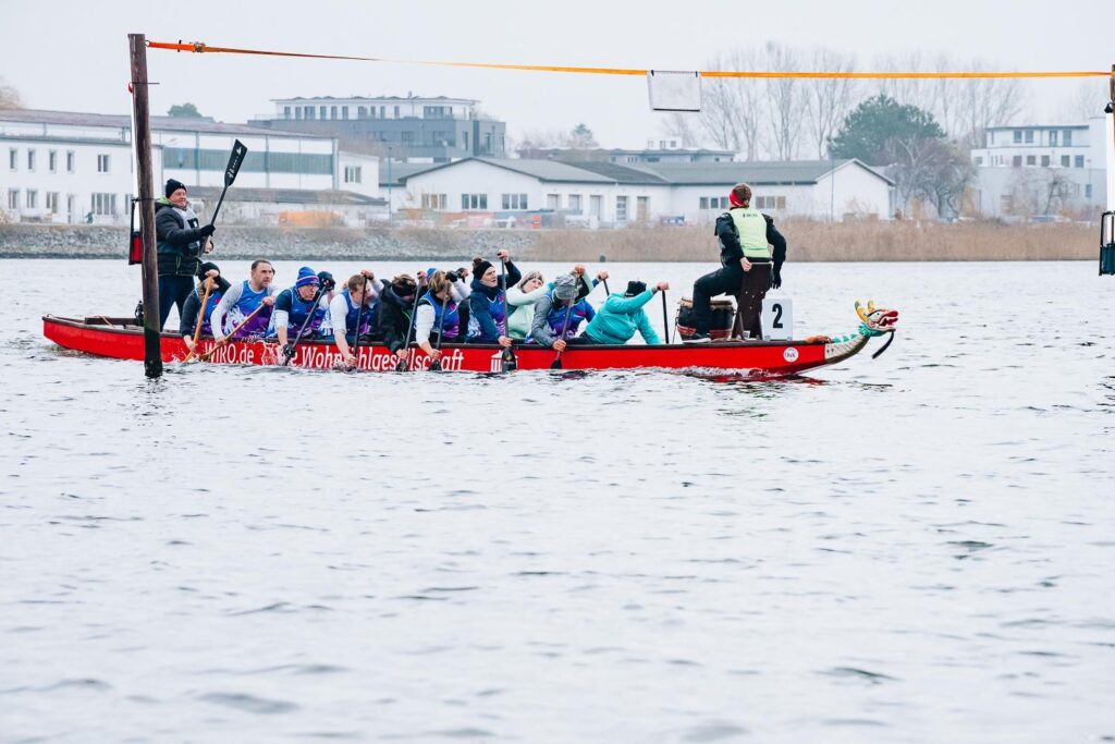 Am Samstag gegen 10 Uhr begannen die, für Rostocker Verhältnisse, lockeren Rennen. 9 Großboote und 3 Smalboate machten sich in 3 Läufen auf den rund 1.000 m langen Rundkurs. Kühl, nicht zu viel Wind aber ein starke Strömung waren die Rahmenbedingungen. Mit zwei kurzfristigen Ausfällen gingen wir mit 16 Paddlern an den fliegenden Start. Nine hatte die Trommel übernommen und erinnerte uns daran doch langsam mal loszupaddeln. So verschenkten wir am Start schon reichlich Zeit. Auch das Anschlagen am Gong bei der Wende kostete uns viel Zeit, ein Paddel und fast den Steuermann. Aber wir waren eins der wenigen Teams die an den Gong überhaupt anschlugen. So überholten uns die Drachen von Holstein aus Kiel noch kurz vor Ende. Die Stimmung war am Boden und so verzichteten wir auf eine mögliche 2. Wertungsrunde. Die Busbesatzung lieb bis zur Siegerehrung – und wir waren nicht letzter! Damit hatten wir nun eigentlich nicht gerechnet. Das hellte die Stimmung ein wenig auf.