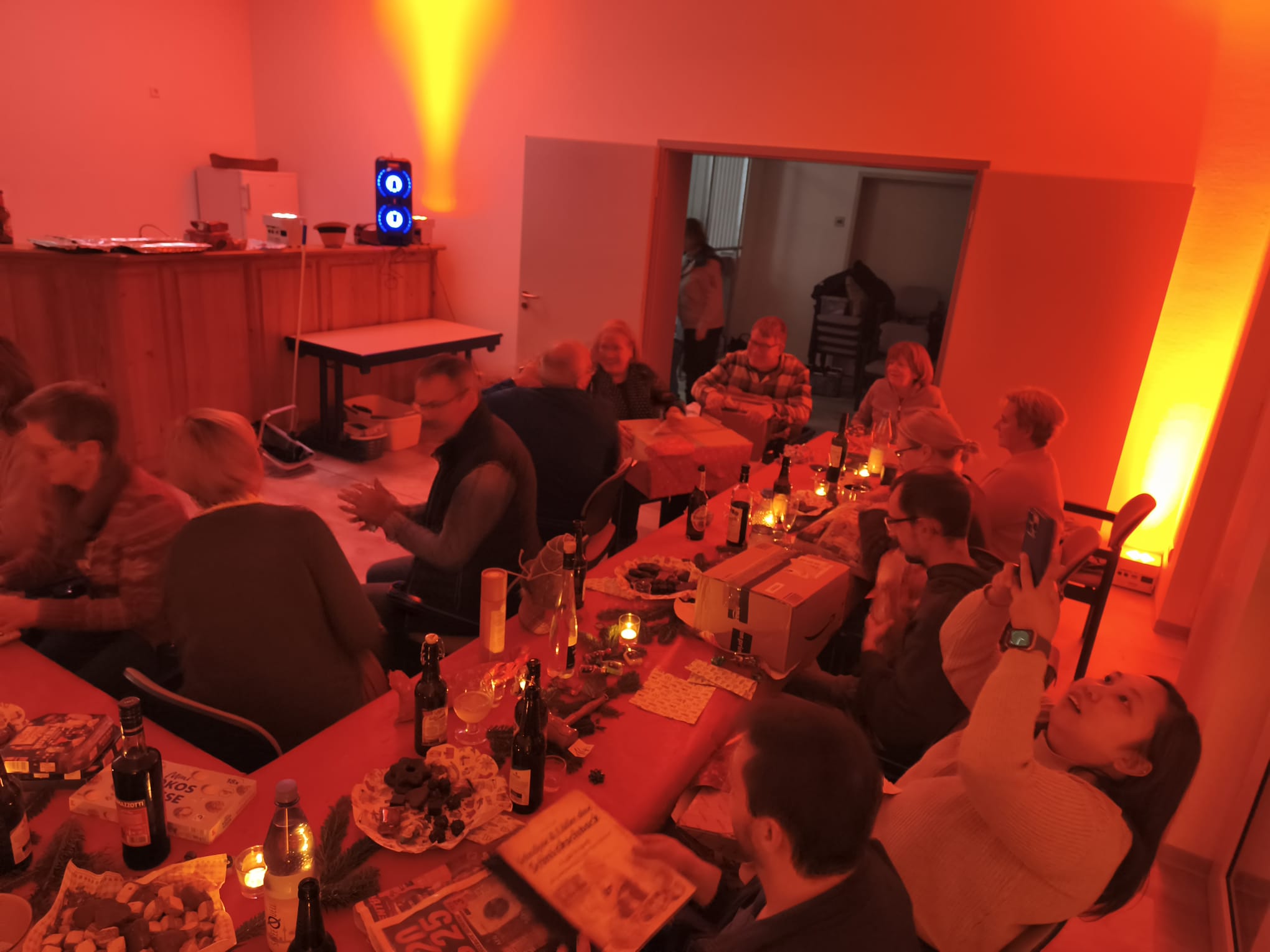 Am 29.011.2025 hieß es Weihnachtsfeier im neuen Clubraum des Bootshauses. Um 14:30 Uhr machten sich die ersten auf zur kleinen Brückenwanderung, ehe gegen 16:30 Uhr das Hauptfeld der Freizeitbrigade eintraf. So waren Matthias und Cloe aus Mainz angereist und auch Petra, Mitbegründerin der Drachenbootsports in Blossin waren dabei. Der doch kühle Clubraum wurde weihnachtlich gestaltet. Nach einem kurzen bildlichen Rückblick auf das vergangene Jahr ging es an das reichhaltige Buffett zu dem alle beigesteuert hatten. Nunja und dann 27 Leute bei der „Faulen Jule“! Wie immer begehrte und weniger begehrte Geschenke. Nur die Akustik muß noch auf die todo Liste genommen werden. Der Lärm von Gesprächen und Musik war schon beträchtlich. Zum Glück gab es die Feuerschale zum entspannten Gespräch.